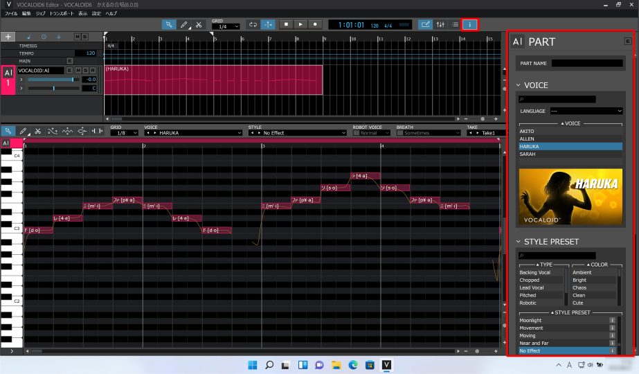 選択するとVOCALOID Editorが自動的に演算をして、声を変えていきます。再生してみましょう。このようにSTYLE PRESETを選ぶことで、色々な歌い方をしてもらうことができます。