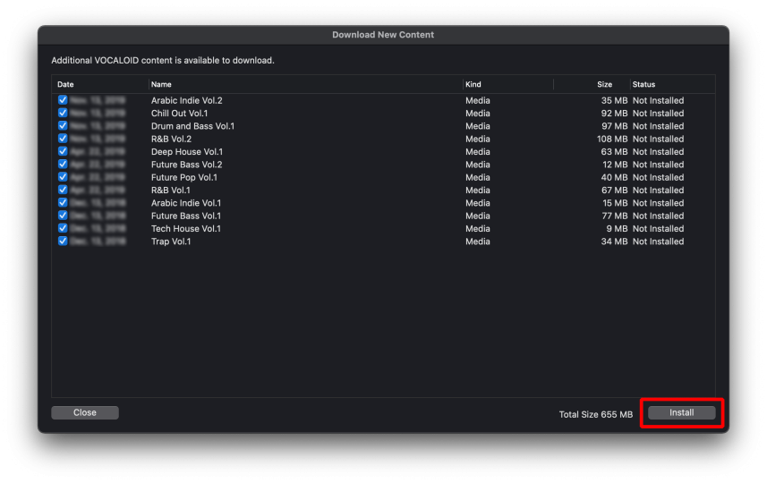 If any of the data used in VOCALOID Editor is found that has not been installed, the following dialog box will appear. The content of the display depends on the data found. Select the required data and choose [Install]. It is recommended that all be installed.
