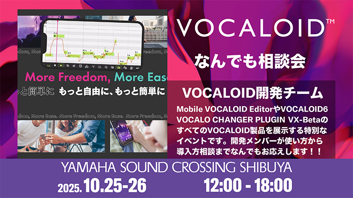「Mobile VOCALOID Editor」をはじめ、最新のVOCALOID製品を一堂に展示する体験イベントを開催します。